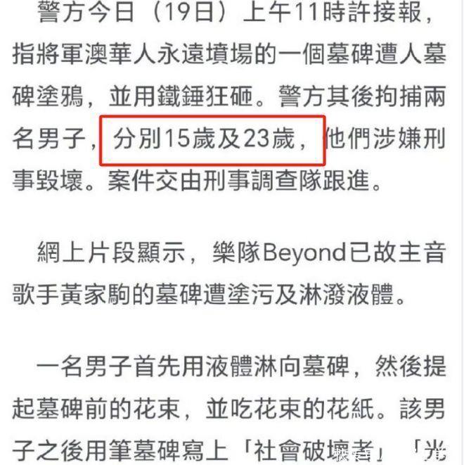 黄家驹生前关联词留住不少励志歌曲的,即便也曾毕命多年,他的歌一直是经典般的存在,以至有许多80,90后依旧是他的赤诚粉丝,当年黄家驹的蓦然离世,也曾让歌迷们祸害不已了,念念不到如今又看到恶东谈主损坏自家偶像的墓碑,这让东谈主如何能忍?而这些嫌疑东谈主的信息,也被曝光了。